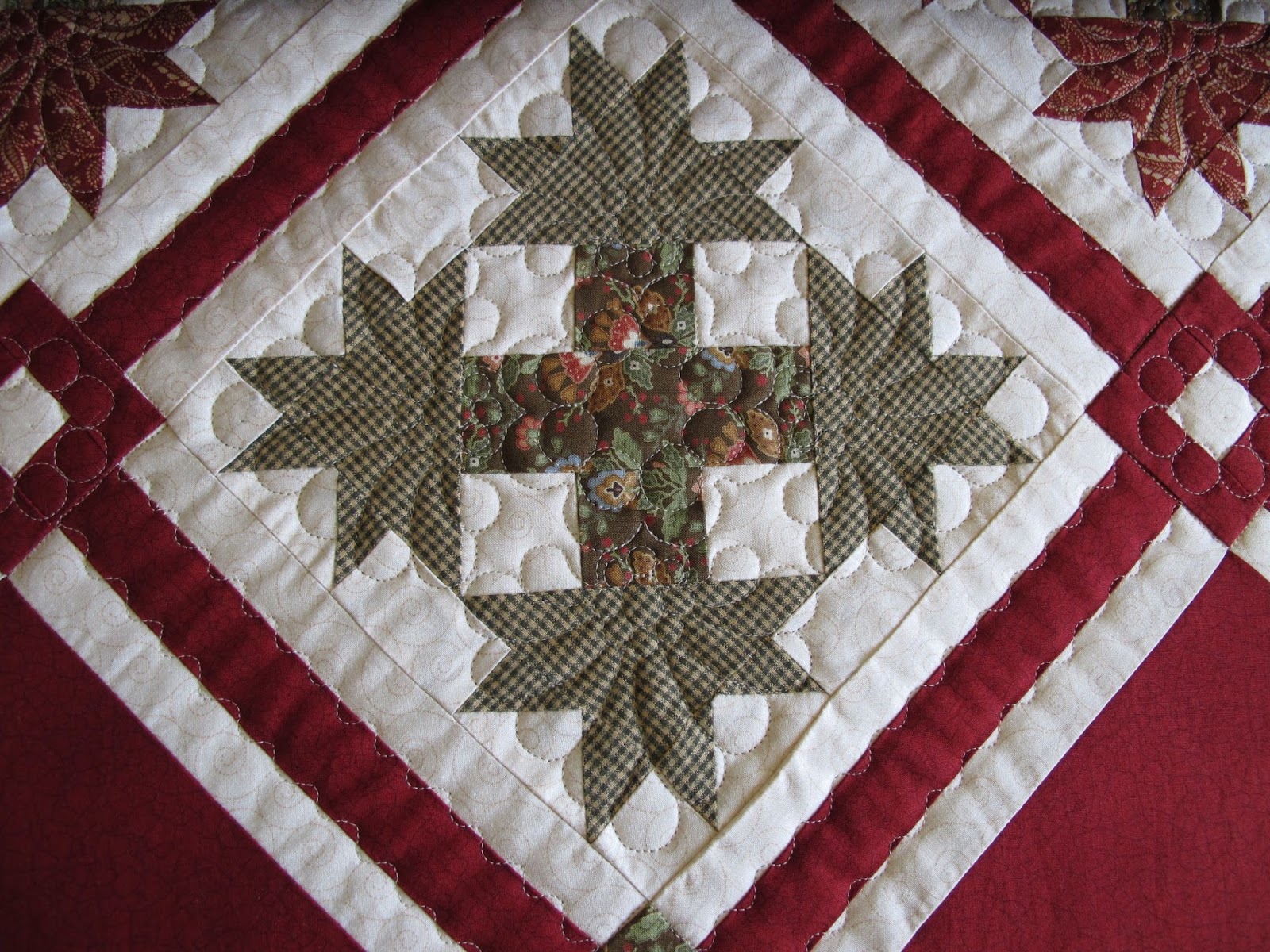 The pattern for this large-sized queen quilt was inspired by a small fragment of an antique quilt, and came from the February 2007 issue of McCall's Quilting. The unique setting highlights the star points and adds interest with pieced sashing posts. Using the cream print as the outer strips of the pieced sashing makes the star points in the blocks appear to float in the setting.